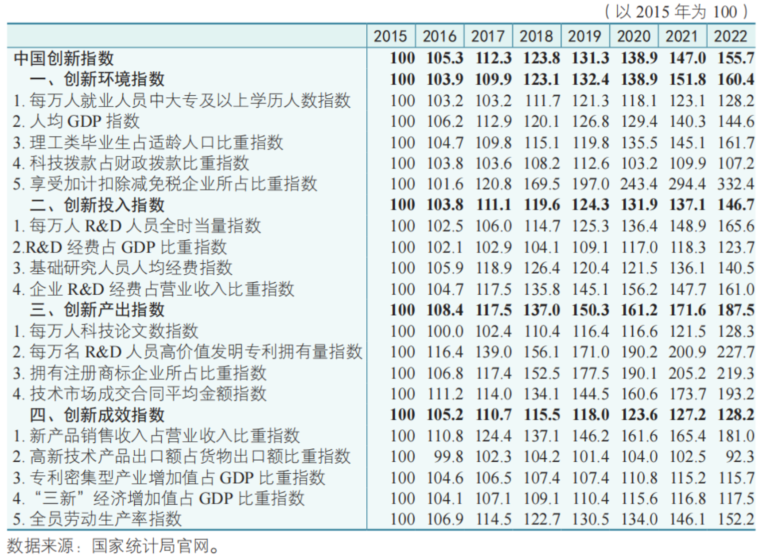 近年来,面对复杂严峻的国内外形势,我国坚持创新在现代化建设全局中的核心地位,深入实施创新驱动发展战略,不断完善创新体系建设,创新能力持续较快提升,为经济社会发展注入了强大动力、提供了有力支撑(测算结果详见表1)。